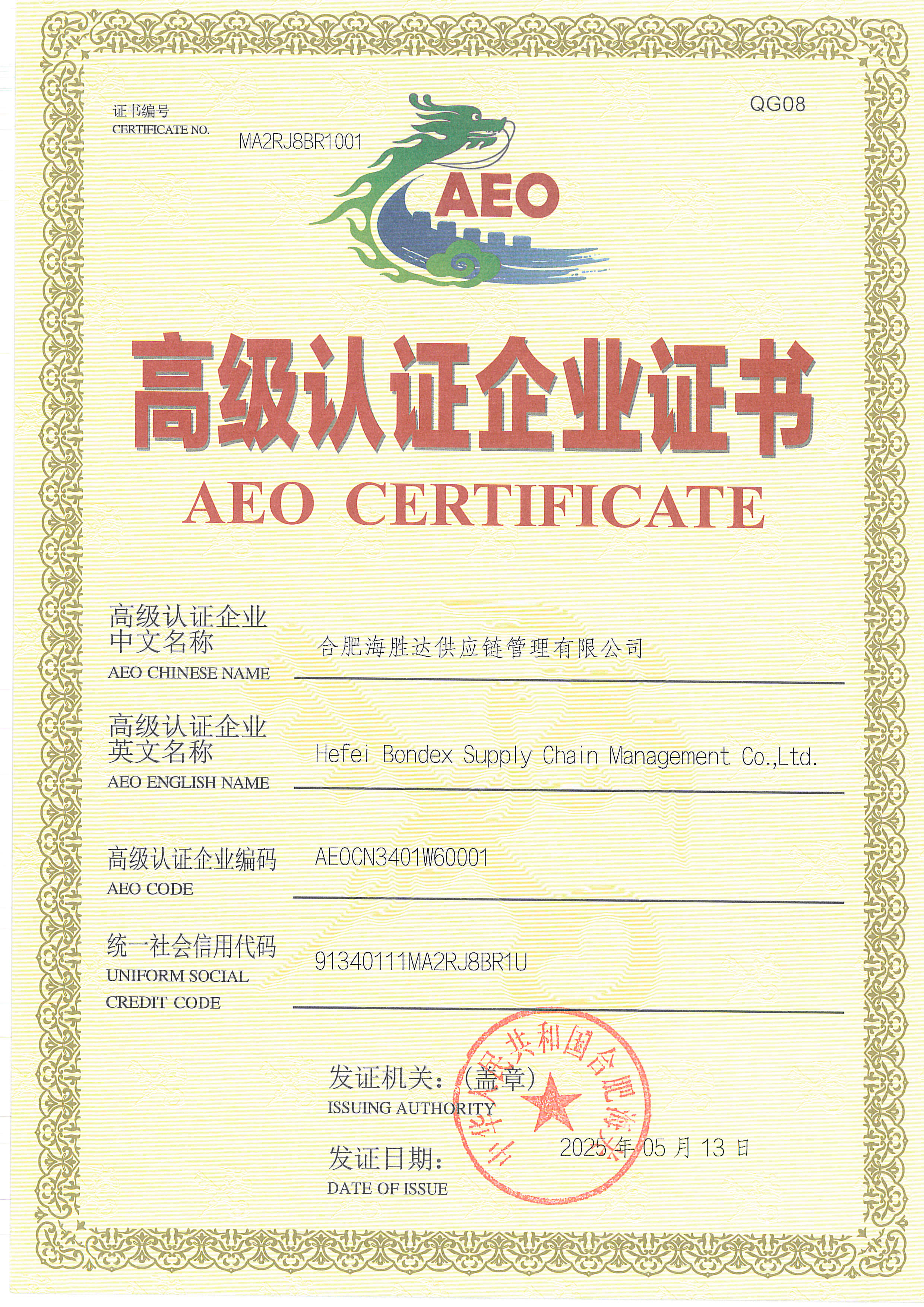 Recently, Hefei Haishengda Supply Chain Management Co., Ltd. (“Hefei Haishengda” in short) has officially been awarded the AEO (Authorized Economic Operator) Advanced Certification by China Customs. This achievement demonstrates that the company has reached international top-tier standards in supply chain security management, compliant operations, and service quality, enabling it to provide more efficient and safer logistics support for semiconductor equipment manufacturers.